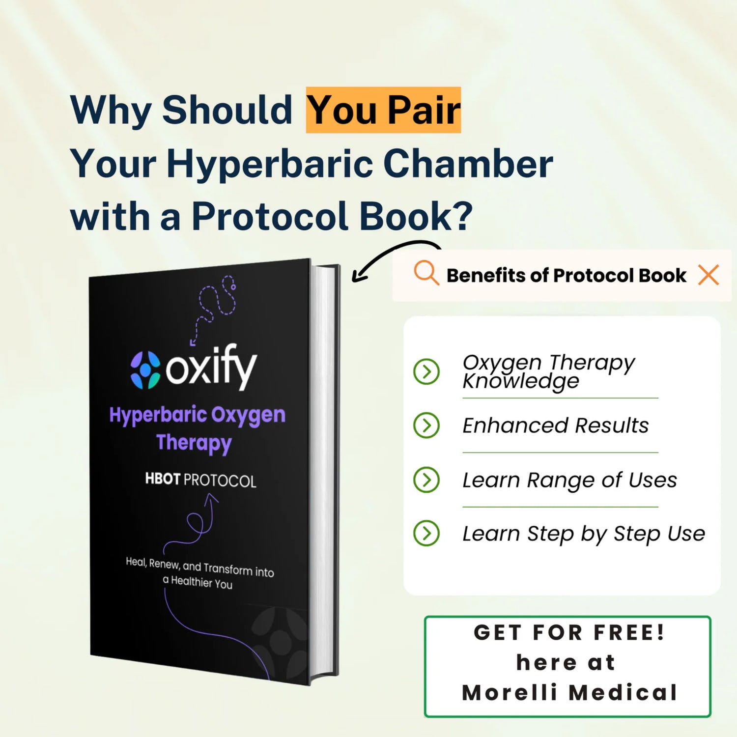 Only at Morelli Medical, every chamber comes with a Free Protocol Book. This guide shows you how to:
