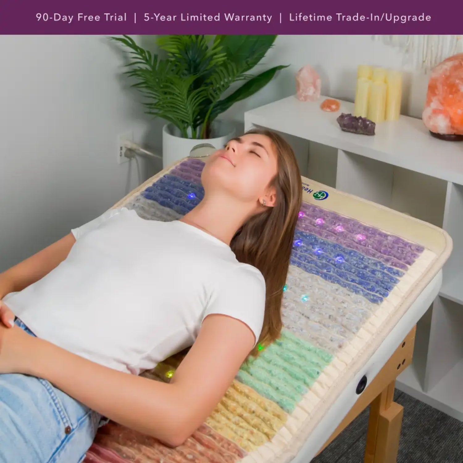 The Rainbow Chakra Mat™ combines PEMF, far infrared heat, red light, negative ions, and seven chakra gemstones to balance mind, body, and spirit. It supports detoxification, improves circulation, relaxes muscles, and promotes deep relaxation ideal for yoga, meditation, or everyday wellness.