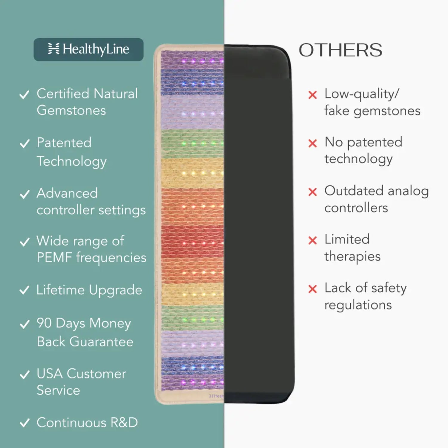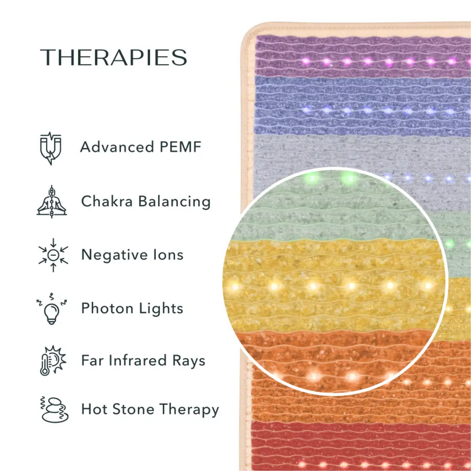All Rainbow Chakra Series mats feature seven integrated therapies: natural far-infrared (FIR), photon light therapy, heated gemstones, negative ions, pulsed electromagnetic field (PEMF), chakra alignment and balancing, and multicolor rainbow lights. The Rainbow Chakra Pillow offers the same therapies, with the exception of PEMF.