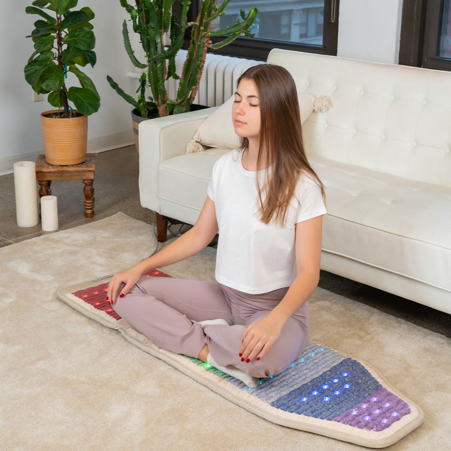 All Rainbow Chakra Series mats feature seven integrated therapies: natural far-infrared (FIR), photon light therapy, heated gemstones, negative ions, pulsed electromagnetic field (PEMF), chakra alignment and balancing, and multicolor rainbow lights. The Rainbow Chakra Pillow offers the same therapies, with the exception of PEMF.